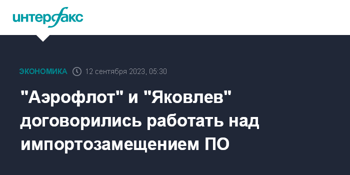 Москва. 12 сентября. INTERFAX.RU - "Аэрофлот" и ПАО "Яковлев" (новое название корпорации "Иркут") подписали соглашение о развитии стратегического сотрудничества в сфере информационных технологий.