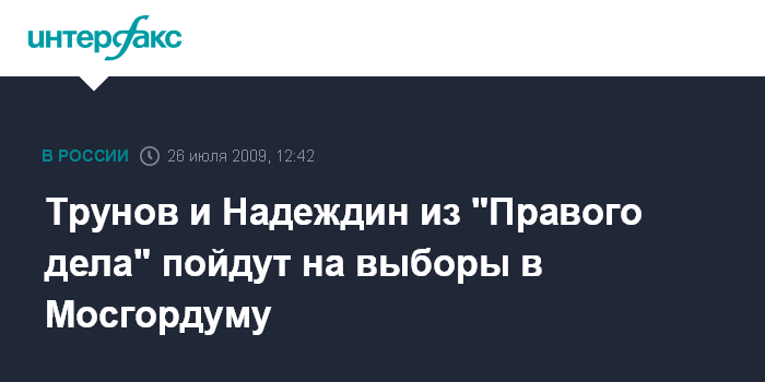 Москва. 26 июля. INTERFAX.RU - Лидер московского отделения "Правого дела" Игорь Трунов и лидер подмосковной организации Борис Надеждин после того, как Федеральный политсовет партии решил не выдвигать список на выборы в Мосгордуму, решили баллотироваться туда самостоятельно.