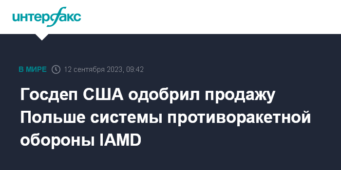 Москва. 12 сентября. INTERFAX.RU - Госдеп США одобрил продажу Польше ключевых элементов интегрированной системы противоракетной обороны IAMD общей стоимостью $4 млрд, сообщило во вторник агентство PAP со ссылкой на информацию Агентства по сотрудничеству в области оборонной безопасности Пентагона (DSCA).