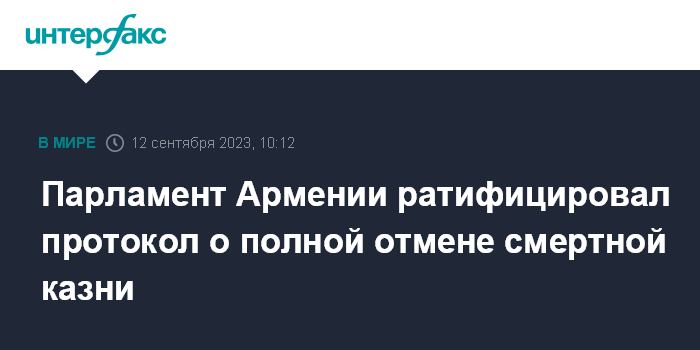 Москва. 12 сентября. INTERFAX.RU - Парламент Армении на заседании во вторник ратифицировал протокол к Конвенции о защите прав человека, предусматривающий полную отмену смертной казни.