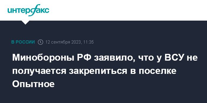Москва. 12 сентября. INTERFAX.RU - Министерство обороны России заявило, что российские военные сохраняют контроль над поселком Опытное в ДНР, отражают атаки украинской армии.