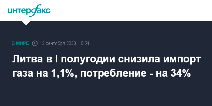 Москва. 12 сентября. INTERFAX.RU - Импорт газа в Литву в январе-июне 2023 года составил 18,8 ТВт.ч, что на 1,1% меньше, чем за аналогичный период прошлого года, сообщает госсовет по регулированию энергетики.