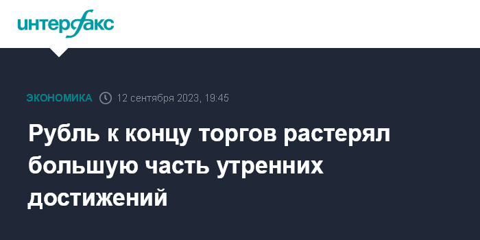 Москва. 12 сентября. INTERFAX.RU - Российский рубль к концу торгов вторника растерял большую часть утренних достижений на фоне снижения ожиданий относительно дальнейшего ужесточения денежно-кредитной политики (ДКП) на заседании Банка России 15 сентября.