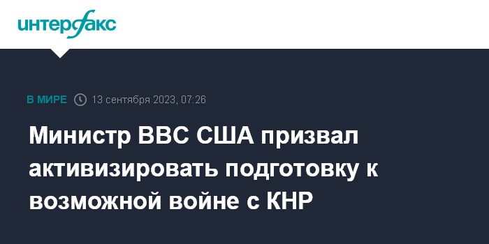 Москва. 13 сентября. INTERFAX.RU - Министр ВВС США Фрэнк Кендалл предупредил, что Китай наращивает свои вооруженные силы для потенциальной войны с США, призвав активизировать подготовку к такому варианту развития событий, сообщило издание The Hill.