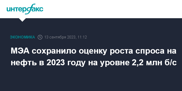 Москва. 13 сентября. INTERFAX.RU - Спрос на нефть в мире в 2023 году вырастет относительно показателя 2022 года на 2,243 млн б/с, говорится в ежемесячном отчете Международного энергетического агентства (МЭА). Организация практически не изменила свой прогноз по сравнению с августовским.