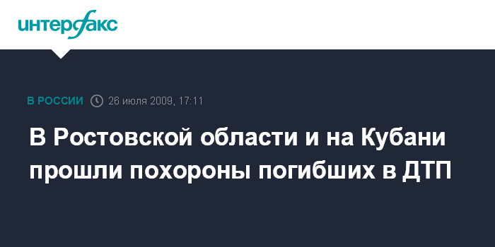 Ростов-на-Дону. 26 июля. INTERFAX.RU - В ряде городов и районов Ростовской области и Краснодарского края простились с жертвами автокатастрофы, произошедшей на трассе М4 "Дон" Москва-Новороссийск в Ростовской области.
