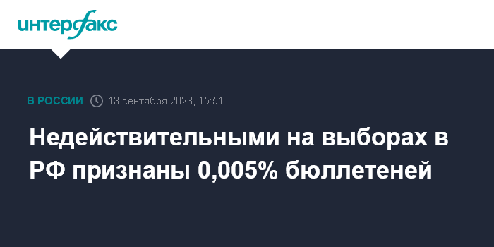 Москва. 13 сентября. INTERFAX.RU - Недействительными признаны 2312 избирательных бюллетеней в 14 регионах на 24 участках - это 0,005%, сообщила глава ЦИК РФ Элла Памфилова.