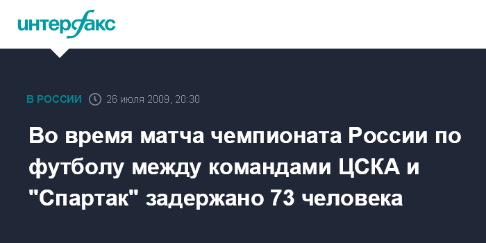 Москва. 26 июля. ИНТЕРФАКС-МОСКВА - За нарушение общественного порядка во время матча 15-го тура чемпионата России по футболу между командами ЦСКА и "Спартак", который проходил в воскресенье на стадионе "Лужники", было задержано 73 человека, сообщила "Интерфаксу" заместитель начальника управления информации и общественных связей ГУВД Москвы Жанна Ожимина.