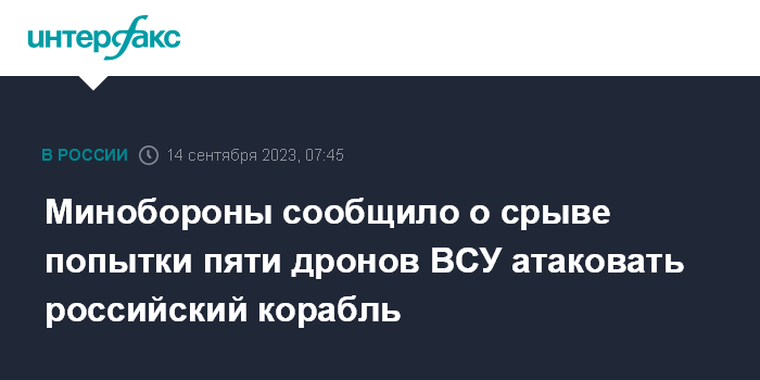 "14 сентября около 05:00 вооруженными силами Украины осуществлена попытка атаковать пятью морскими безэкипажными катерами патрульный корабль Черноморского флота "Сергей Котов" в акватории Черного моря. В ходе отражения атаки пять безэкипажных катеров противника уничтожены огнем из штатного вооружения корабля", - говорится в сообщении .