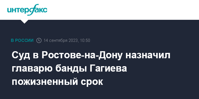 Москва. 14 сентября. INTERFAX.RU - Южный окружной военный суд (Ростов-на-Дону) приговорил к пожизненному заключению Аслана Гагиева по делу об организации преступного сообщества, действовавшего в Москве, Московской области и Северной Осетии, передает корреспондент "Интерфакса" из зала суда.