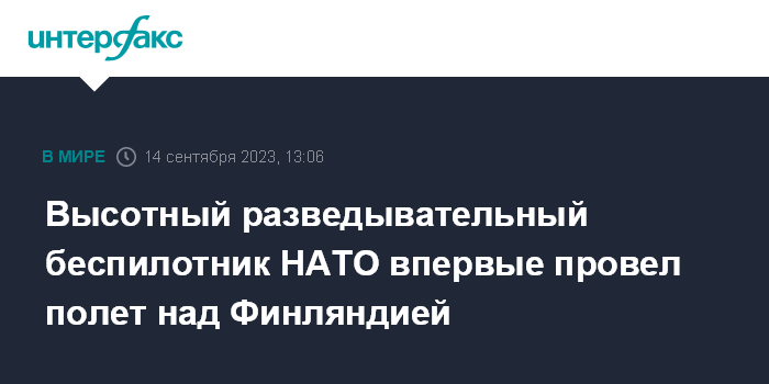 Москва. 13 сентября. INTERFAX.RU - Дальний высотный разведывательный беспилотный летательный аппарат (БПЛА) НАТО RQ-4D впервые совершил полет над новым членом блока Финляндией, сообщило в четверг Воздушное командование альянса.
