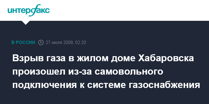 Хабаровск. 27 июля. ИНТЕРФАКС - ДАЛЬНИЙ ВОСТОК - Причиной взрыва газа в пятиэтажном жилом доме в Хабаровске, по предварительным данным, стало незаконное подключение к системе газоснабжения.