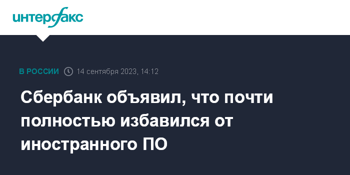 Москва. 14 сентября. INTERFAX.RU - Сбербанк практически полностью избавился от иностранного программного обеспечения, заявил управляющий директор департамента ИТ-блока "Сеть продаж" Сбербанка Валерий Толкачев.