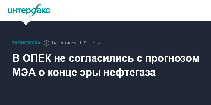 Москва. 14 сентября. INTERFAX.RU - Прогнозы о начале конца эры ископаемого топлива, аналогичные сделанному Международным энергетическим агентством (МЭА), основаны на идеологии, а не данных; их появление часто сопровождается призывами прекратить инвестиции в нефтегаз, что может вызвать энергетический хаос, заявили в ОПЕК.