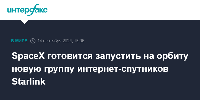 Москва. 14 сентября. INTERFAX.RU - Ракета-носитель Falcon 9 американской компании SpaceX в пятницу может вывести на орбиту очередную группу из 22-х интернет-спутников Starlink, сообщает специализированное издание Spaceflight Now.