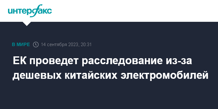 Москва. 14 сентября. INTERFAX.RU - Еврокомиссия (ЕК) проведет расследование в связи с увеличением на рынке ЕС дешевых электромобилей из Китая, заявила официальный представитель ЕК Мириам Гарсия Феррер.