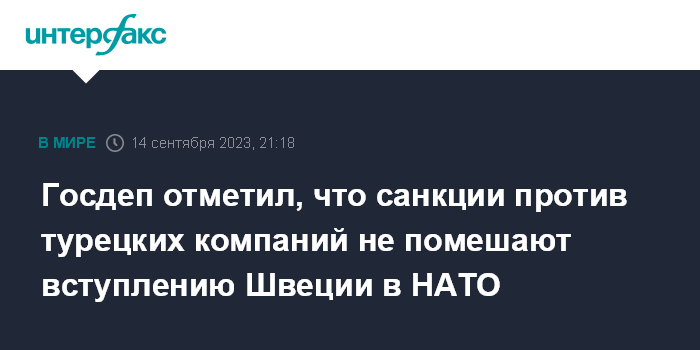 Москва. 14 сентября. INTERFAX.RU - Санкции, которые США ввели против турецких компаний, не должны как-либо влиять на процесс ратификации Анкарой членства Швеции в НАТО, заявил в четверг представитель Госдепартамента Мэтью Миллер.