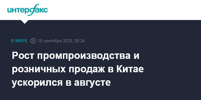 Москва. 15 сентября. INTERFAX.RU - Темпы роста промышленного производства и розничных продаж в Китае в августе ускорились, безработица снизилась.
