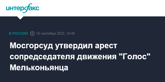 Москва. 15 сентября. INTERFAX.RU - Московский городской суд оставил без изменений решение первой инстанции об аресте сопредседателя движения "Голос" (признано в РФ иноагентом) Григория Мельконьянца по уголовному делу о деятельности нежелательной в РФ организации, сообщили "Интерфаксу" в пресс-службе суда.