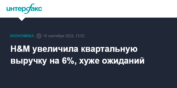 Москва. 15 сентября. INTERFAX.RU - Hennes & Mauritz AB (H&M), владелец второй по величине в Европе сети магазинов одежды, в третьем квартале 2023 финансового года (июнь-август) нарастил выручку на 6%, что оказалось хуже прогноза.