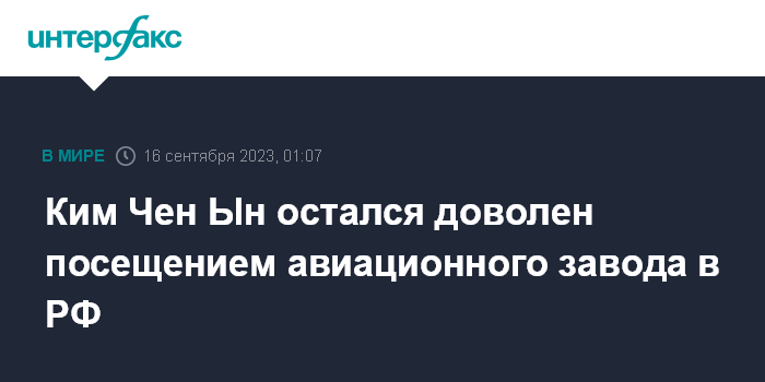 Москва. 16 сентября. INTERFAX.RU - Лидер КНДР Ким Чен Ын заявил, что был впечатлен увиденным во время визита на авиационный завод имени Гагарина в Комсомольске-на-Амуре, сообщают южнокорейские СМИ со ссылкой на ЦТАК.
