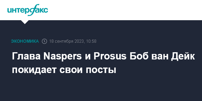 Москва. 18 сентября. INTERFAX.RU - Главный исполнительный директор южноафриканской Naspers Ltd. и ее дочерней компании Prosus NV Боб ван Дейк покидает свои посты 18 сентября, говорится в пресс-релизе Naspers.