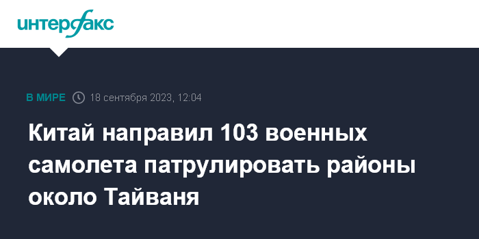 Москва. 18 сентября. INTERFAX.RU - Китайские военные за последние сутки направили на патрулирование в районы близ Тайваня 103 самолета, сообщает AP со ссылкой на ВС Тайваня.