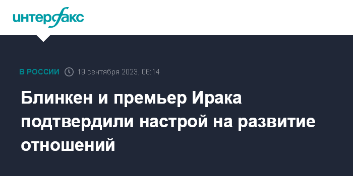 Москва. 19 сентября. INTERFAX.RU - Госсекретарь США Энтони Блинкен и премьер-министр Ирака Мухаммед Шиа аль-Судани подтвердили готовность к продолжению развития отношений и укреплению партнерства, сообщил госдепартамент.
