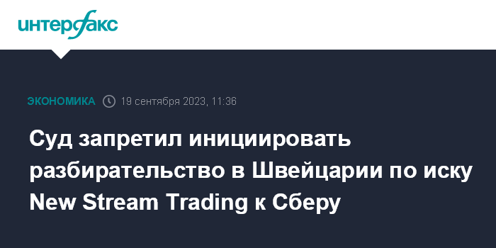 В июне 2023 года Арбитражный суд Москвы отказал в исполнении поручения Верховного суда кантона Цуг о вручении судебных документов Сбербанку по иску New Stream Trading. Эта компания в мае 2022 года обратилась в швейцарский суд с исковыми требованиями к Сбербанку, в том числе, об обязании в рамках солидарной ответственности выплатить $520 и $40 млн вместе с процентами.