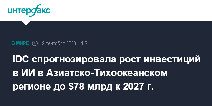 Москва. 19 сентября. INTERFAX.RU - Инвестиции в искусственный интеллект (ИИ) в Азиатско-Тихоокеанском регионе (АТР), включая затраты на программное и аппаратное обеспечение, а также различного рода услуги в рамках ИИ-систем, вырастут до $78,4 млрд к 2027 году. Об этом говорится в прогнозе International Data Corporation (IDC).