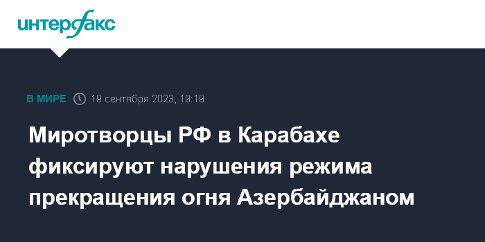 "С 12:00 19 сентября 2023 г. российским миротворческим контингентом фиксируются многочисленные факты нарушения режима прекращения огня с азербайджанской стороны по всей линии соприкосновения", - говорится в бюллетене о деятельности российского миротворческого контингента в Нагорном Карабахе, опубликованном на сайте ведомства.