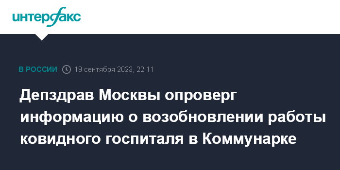 Москва. 19 сентября. INTERFAX.RU - Информация о возобновлении работы коронавирусного госпиталя в Коммунарке не соответствует действительности, сообщили "Интерфаксу" в пресс-службе столичного департамента здравоохранения.