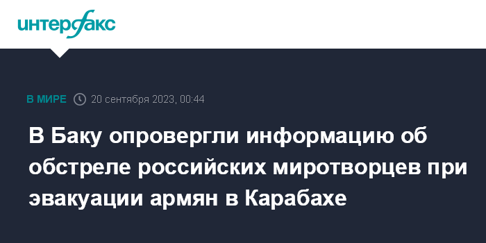 "Размещенная на некоторых аккаунтах в армянском сегменте социальных медиа информация о якобы имевшем место обстреле Вооруженными Силами Азербайджана колонны российского миротворческого контингента, эвакуировавшего жителей армянского происхождения (в Карабахе - ИФ), не соответствует действительности и является дезинформацией. Категорически опровергаем эти безосновательные утверждения", - говорится в заявлении Минобороны Азербайджана.