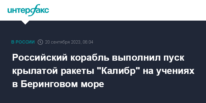 Москва. 20 сентября. INTERFAX.RU - Российский корвет на учениях в Беринговом море выполнил стрельбу крылатой ракетой "Калибр" по морской мишени, сообщили в Минобороны РФ в среду.