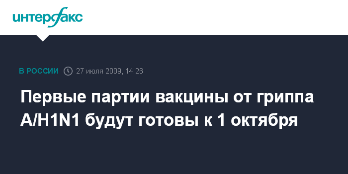 Москва. 27 июля. INTERFAX.RU - Первые партии вакцины от вируса H1N1 будут готовы к 1 октября, сообщил директор НИИ гриппа РАМН Олег Киселев на пресс-конференции в Петербурге в понедельник.