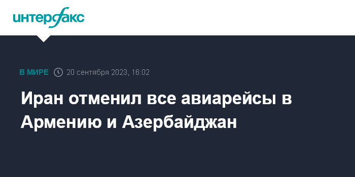 Москва. 20 сентября. INTERFAX.RU - На фоне обострения ситуации в Нагорном Карабахе иранские власти отменили с 20 сентября все авиарейсы в Армению и Азербайджан.