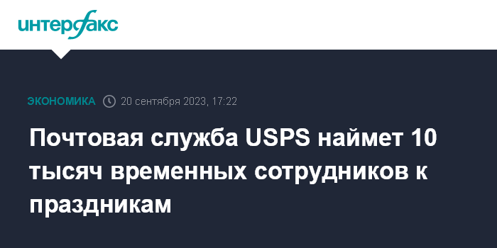 Москва. 20 сентября. INTERFAX.RU - Почтовая служба США (U.S. Postal Service, USPS) планирует нанять 10 тысяч дополнительных работников и задействовать 395 новых машин для сортировки посылок на время праздников, говорится в пресс-релизе USPS.