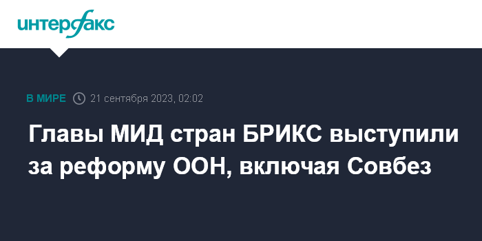 Москва. 21 сентября. INTERFAX.RU - Главы внешнеполитических ведомств стран БРИКС в заявлении по итогам встречи на полях 78-й сессии Генассамблеи ООН поддержали реформу организации, включая ее Совет Безопасности.