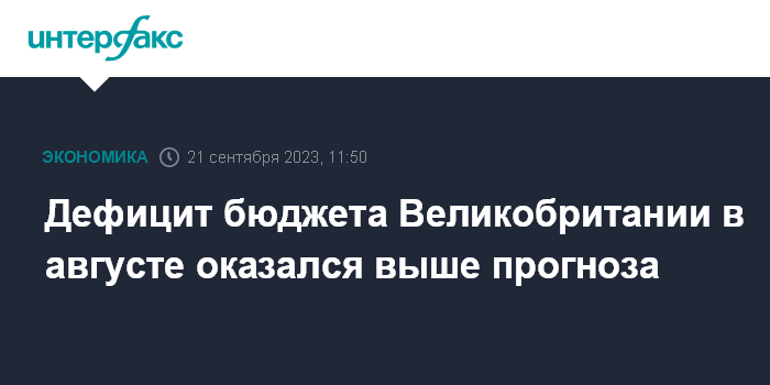 Москва. 21 сентября. INTERFAX.RU - Великобритания в августе зафиксировала дефицит бюджета в размере 11,6 млрд фунтов ($14,27 млрд), сообщило Национальное статистическое управление (ONS).