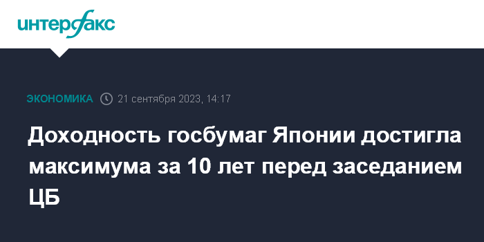 Москва. 21 сентября. INTERFAX.RU - Доходность десятилетних государственных облигаций Японии поднялась до 0,745% годовых, в ожидании итогов заседания центробанка страны.