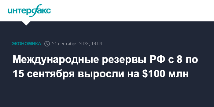 Международные резервы РФ с 8 по 15 сентября выросли на $100 млн