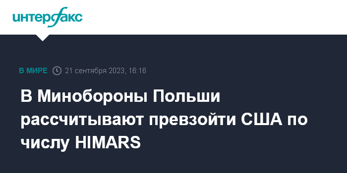 Москва. 21 сентября. INTERFAX.RU - На вооружении у Польши будет больше РСЗО HIMARS, чем у США, заявил на пресс-конференции на военном предприятии Wojskowe Zaklady Elektroniczne в Зеленке министр национальной обороны Мариуш Блащак. Его цитирует агентство PAP.