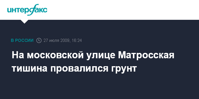 Москва. 27 июля. INTERFAX.RU - Провал грунта произошел на московской улице Матросская тишина в районе дома N15 днем в понедельник, сообщил "Интерфаксу" источник в правоохранительных органах города. Как рассказал собеседник агентства, на поверхности образовался провал размерами три на три метра. Он добавил, что в результате инцидента никто не пострадал. В настоящее время место происшествия оцеплено, выясняются причины провала, в ближайшее время начнутся работы по его устранению.