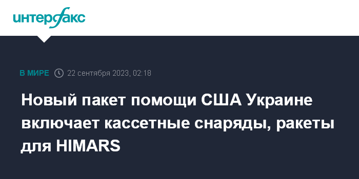 Москва. 22 сентября. INTERFAX.RU - В пакет новой помощи, которую США предоставляют Киеву, вошли кассетные и артиллерийские снаряды, ракеты для HIMARS, пулеметы для противодействия беспилотникам, сообщает госдепартамент.