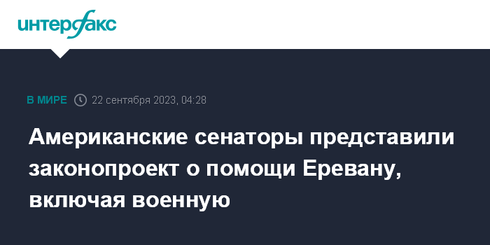 Москва. 22 сентября. INTERFAX.RU - Группа американских сенаторов, как демократов, так и республиканцев, разработали законопроект об оказании помощи Армении, в том числе военной, и введению санкций в отношении Азербайджана.