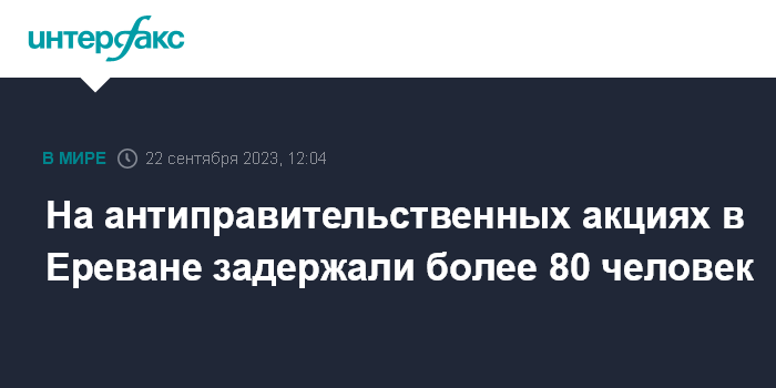 Москва. 22 сентября. INTERFAX.RU - Более 80 человек задержаны на антиправительственных акциях в Ереване, сообщили "Интерфаксу" в полиции Армении.