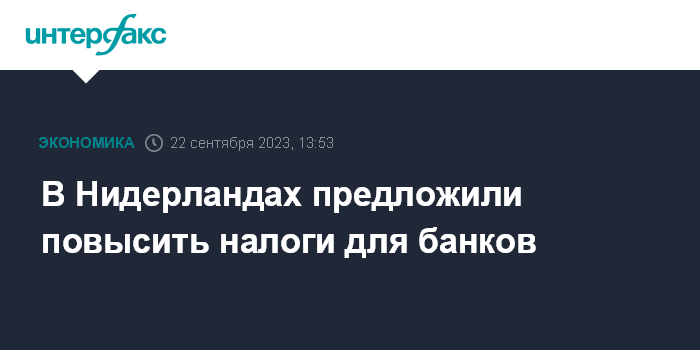 Москва. 22 сентября. INTERFAX.RU - Парламент Нидерландов предлагает повысить налоги для банков, а также ввести налог на обратный выкуп акций, чтобы привлечь в бюджет средства для финансирования социальных программ.