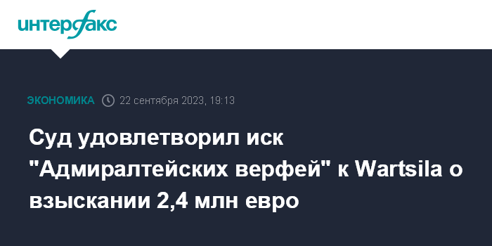 Москва. 22 сентября. INTERFAX.RU - Арбитражный суд Санкт-Петербурга и Ленинградской области удовлетворил иск АО "Адмиралтейские верфи" к финскому производителю судового энергетического оборудования Wartsila на 2,377 млн евро, сообщается в картотеке арбитражных дел.