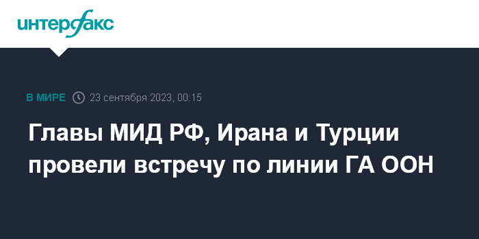Москва. 23 сентября. INTERFAX.RU - Главы МИД РФ, Ирана и Турции Сергей Лавров, Хосейн Амир Абдоллахиан и Хакан Фидан проводят встречу в астанинском формате на "полях" мероприятий по линии ГА ООН.