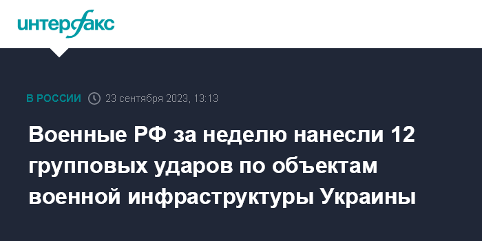 Москва. 23 сентября. INTERFAX.RU - Российские военные за неделю нанесли 12 групповых ударов дронами, наземными и авиационными ракетами по украинским объектам ремонта военной техники, оружейным складам, центрам разведки и пунктам размещения иностранных наемников, заявил официальный представитель Минобороны РФ Игорь Конашенков.